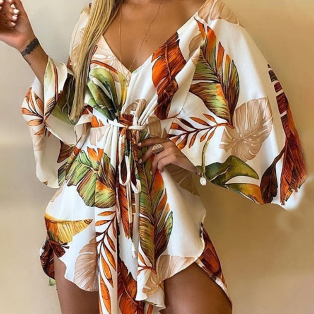 Vestido Feminino Sexy Manga Asa De Morcego Estampado Mini Outono Casual Decote Em V Irregular Com Renda Vestidos Soltos
