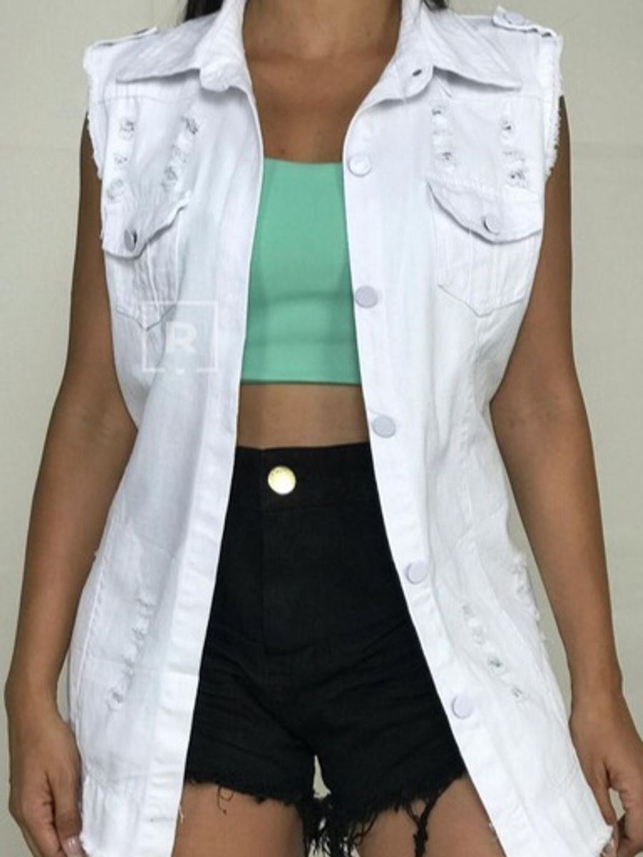 Colete Jeans Feminino Max Colete Branco Comprido Com 2 Bolsos