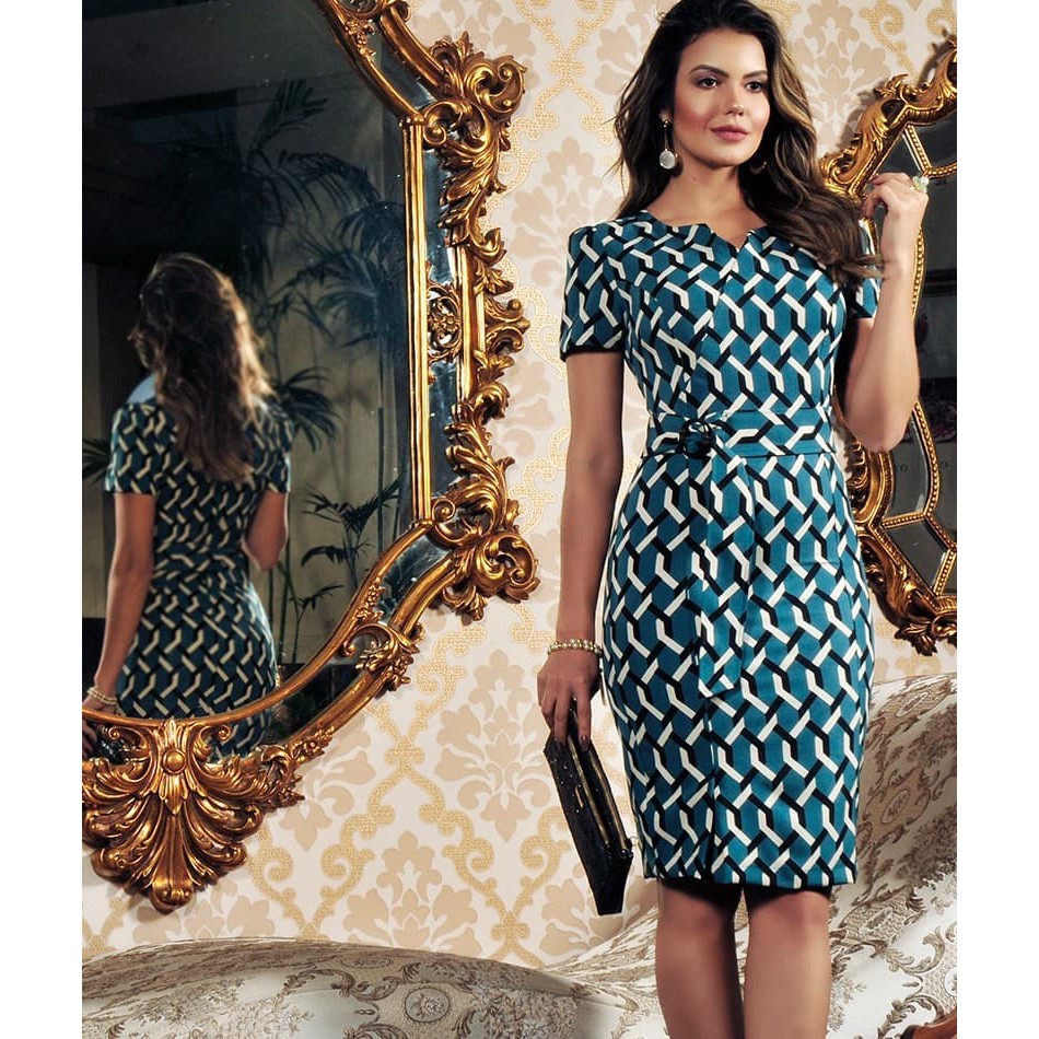 Vestido tubinho cor estampado azim trico cinto do mesmo tecido Tamanho PP
