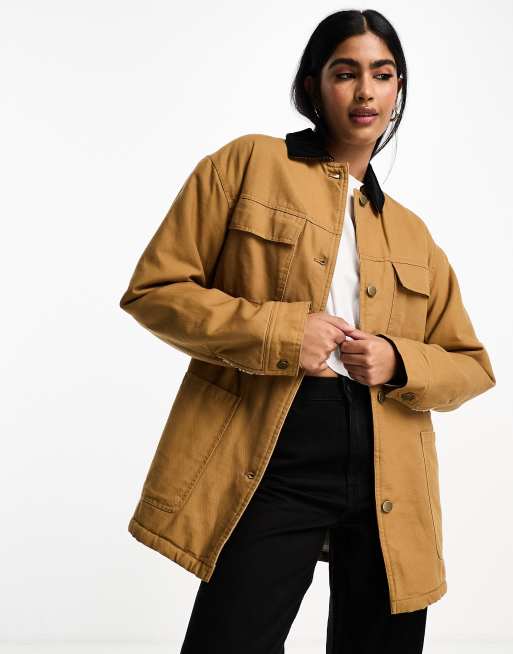 Asos long coat clearance womens, ASOS DESIGN canvas jacket with borg lining and cord collar in tan clearance