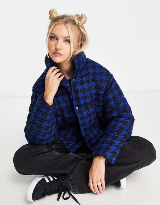 ASOS DESIGN houndstooth puffer coat in blue