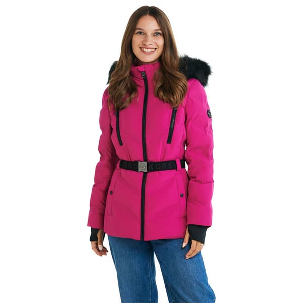 Plus Size Michael Kors Short Belted Puffer Coat w Faux Fur Hood