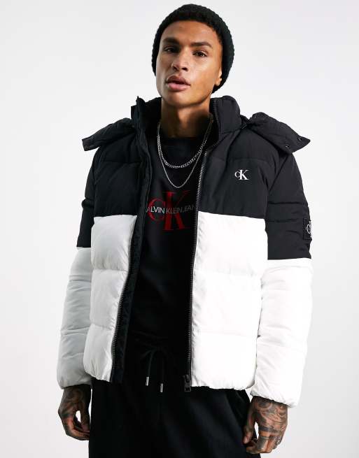 Calvin Klein Jeans color block hooded puffer jacket in black white