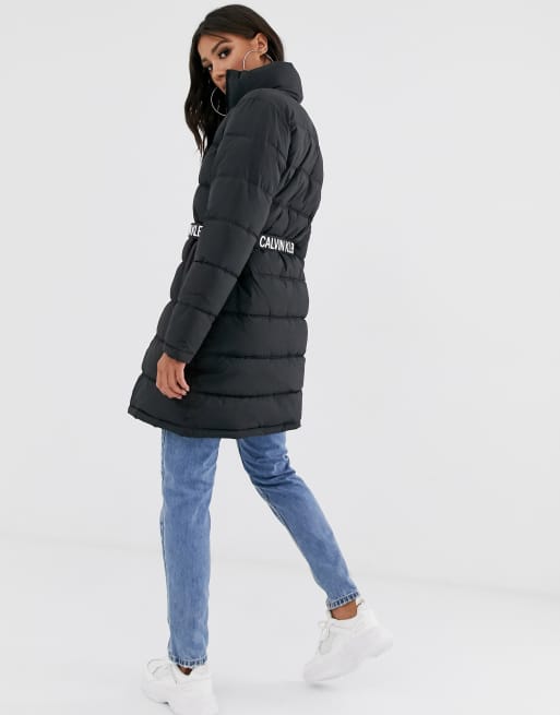 Calvin Klein Jeans logo belt long puffer jacket in black