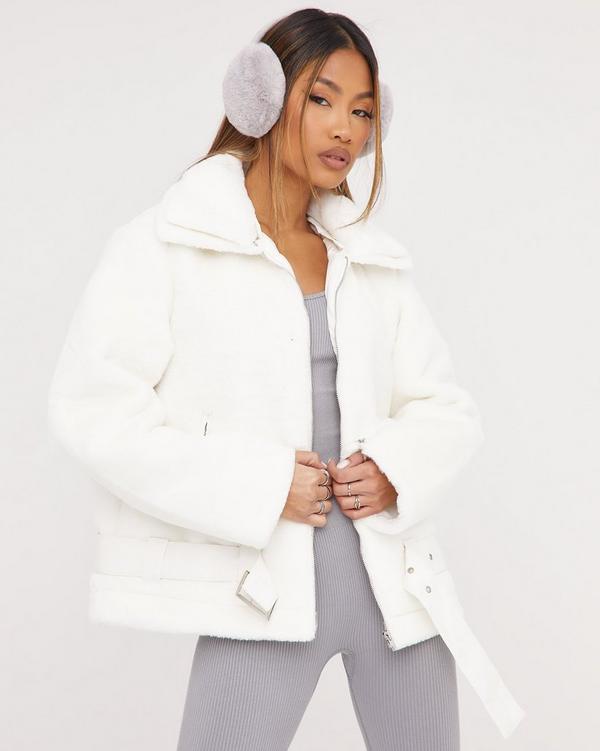 Buckle Detail Aviator Coat In Cream Faux Fur EGO
