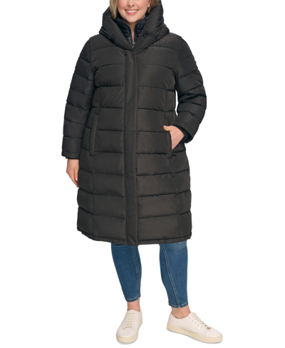Dkny long down clearance coat, Dkny Women s Plus Size Bibbed Hooded Puffer Coat In Black ModeSens clearance