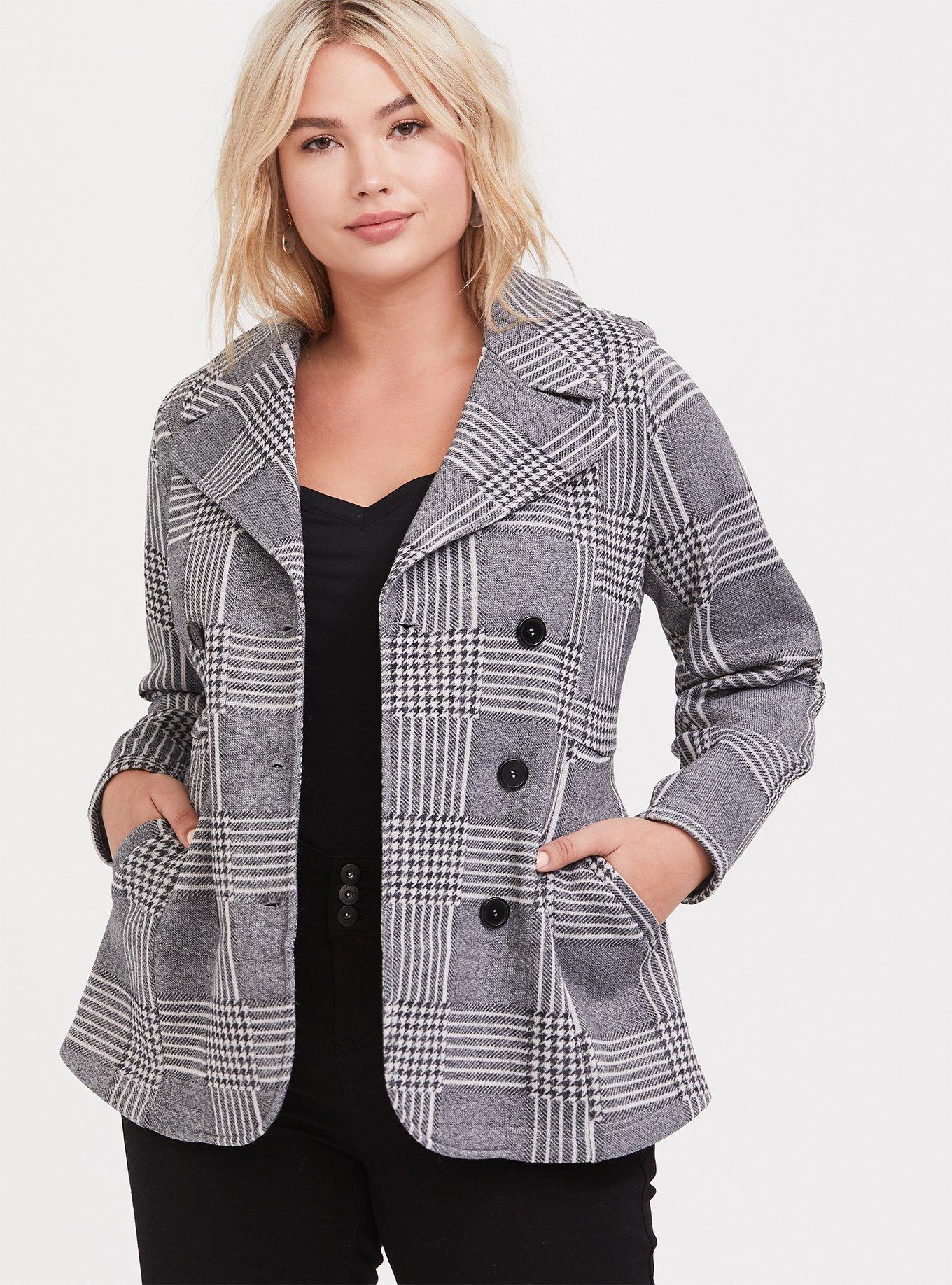 Plus Size Grey Houndstooth Plaid Double Breasted Pea Coat Torrid