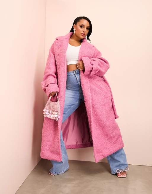Long pink teddy clearance bear coat, ASOS LUXE Curve borg long line trench coat with belted waist in clearance
