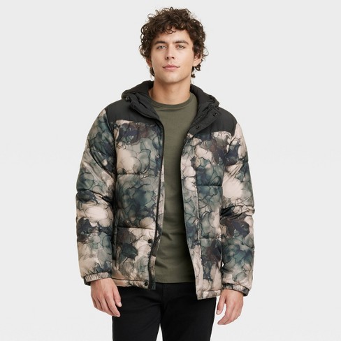 Men s Abstract Print Midweight Puffer Jacket Goodfellow Co Tan XXL
