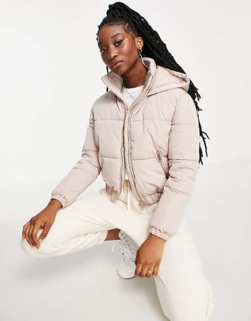 Miss Selfridge short hooded puffer jacket in mink ASOS