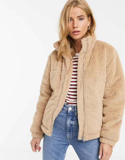 New Look faux fur cord puffer jacket in camel