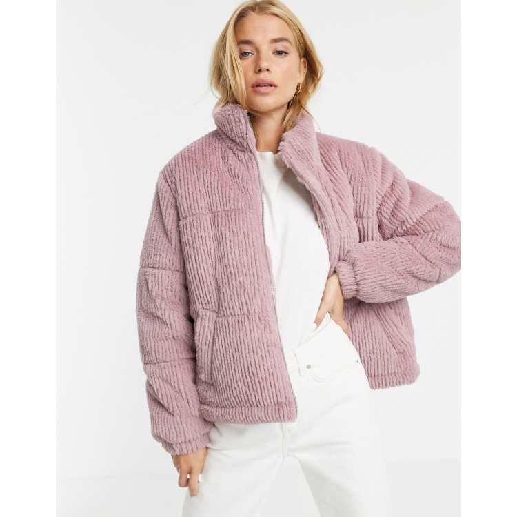 New Look faux fur cord puffer jacket in light pink ASOS