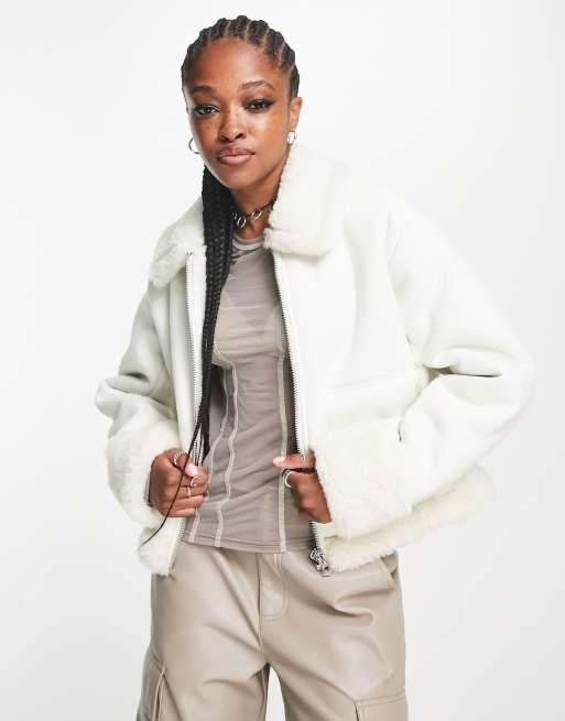 Weekday Enzo faux suede aviator jacket with borg lining in off