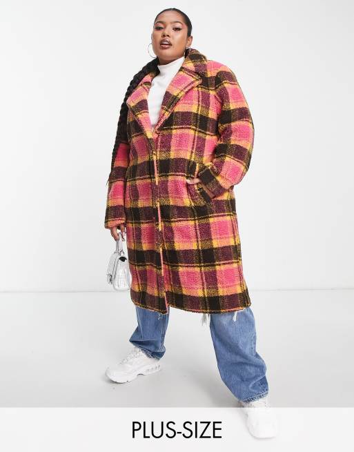 Plus size borg clearance coat, Threadbare Plus Bear oversized teddy borg coat in black and pink check clearance