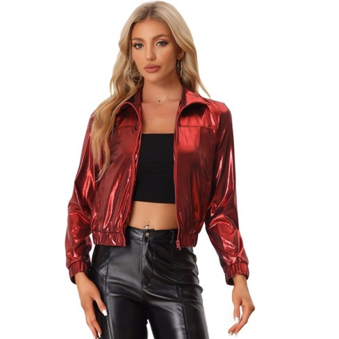 Allegra K Women s Holographic Shiny Long Sleeve Metallic Zip Front Track Jacket Dark Red X Large