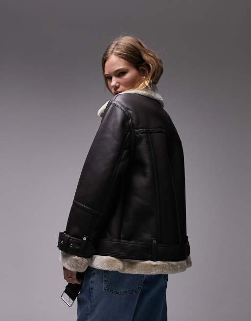 Topshop faux leather shearling oversized aviator biker jacket in black