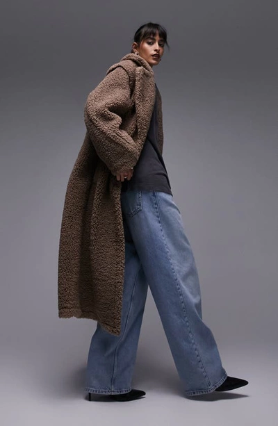 Topshop Fluffy Long Line Teddy Coat In Brown ModeSens