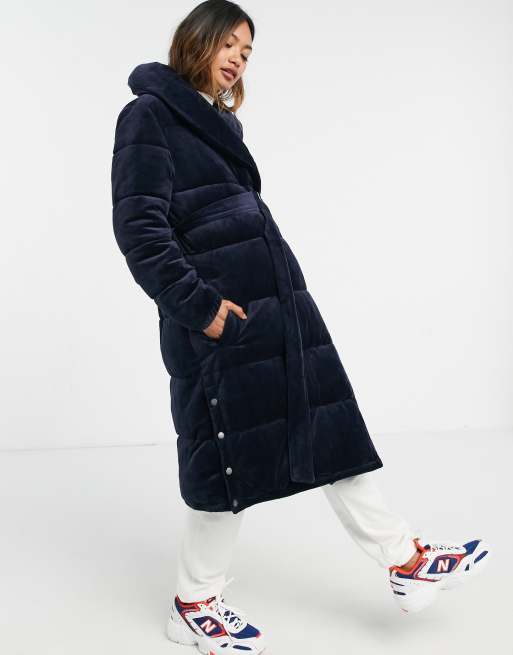 Gianni Feraud Navy velvet longline puffer coat with shawl collar and tie belt