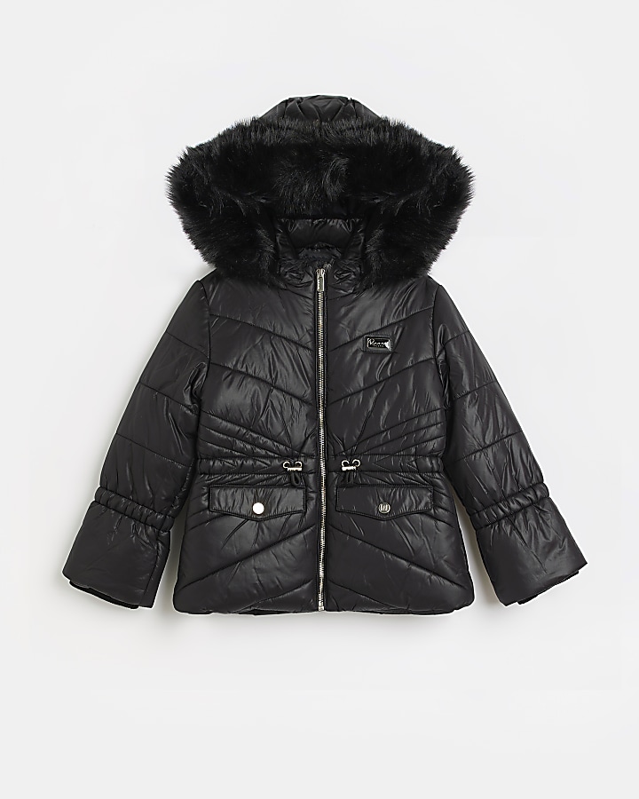 Girls river island clearance black coat, Mini Girls Black Faux Fur Trim Puffer Coat clearance