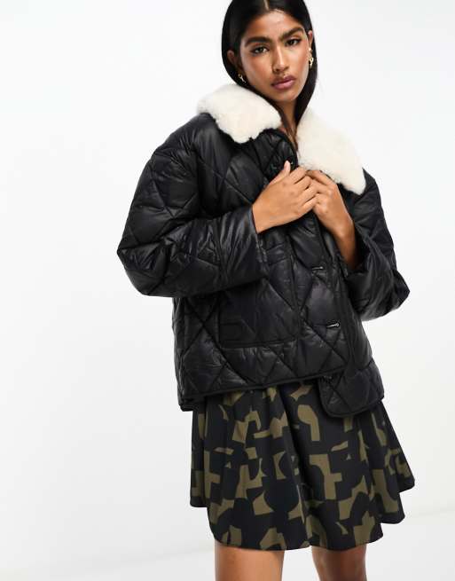 River Island padded jacket with faux fur collar in black ASOS
