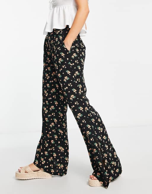 Black Tropical Print Satin Wide Leg Trousers New Look