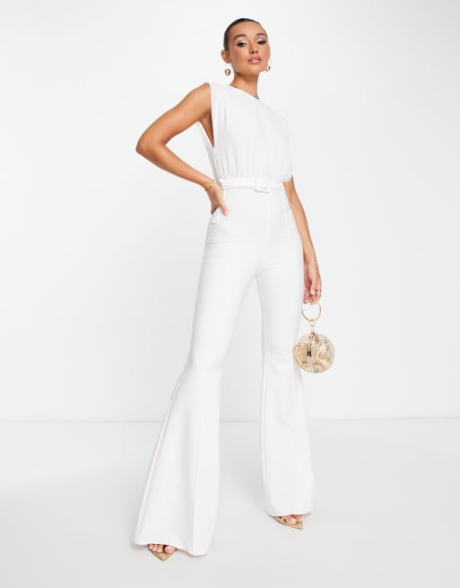 ASOS DESIGN chiffon top belted flared leg jumpsuit in white