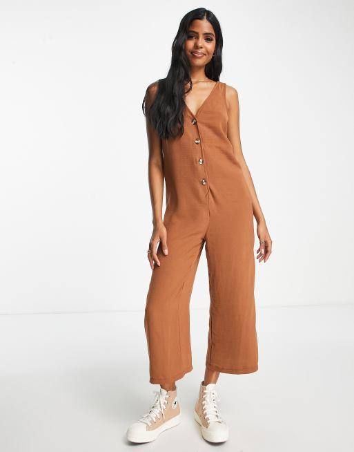 New Look button front relaxed cropped jumpsuit in brown ASOS