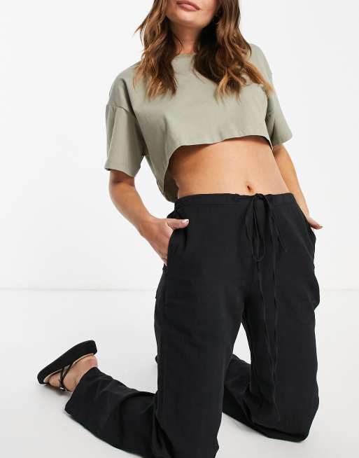 ASOS DESIGN wide leg drawstring waist linen trouser in black