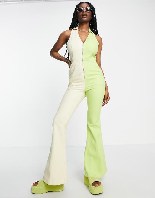 ASOS DESIGN twill zip front collar retro flare jumpsuit in color block