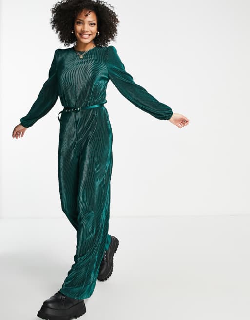 ASOS DESIGN long sleeve belted plisse jumpsuit in forest green