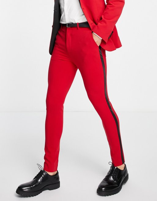 ASOS DESIGN super skinny tuxedo trousers in red with satin side stripe