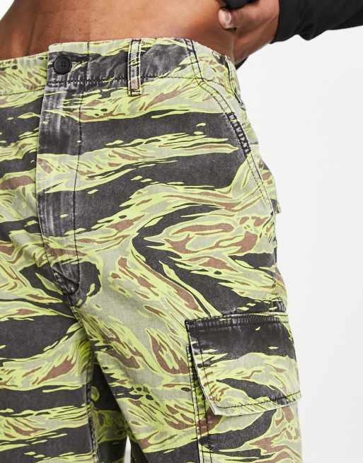 Mens green camo clearance cargo pants, COLLUSION festival washed camo printed cargo trousers in black and clearance