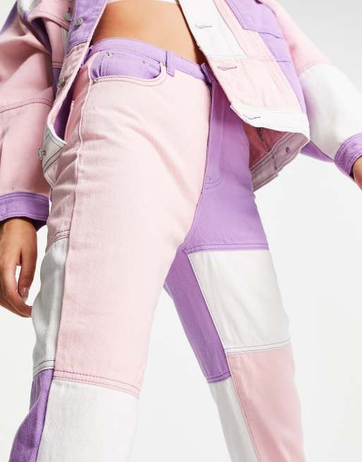Purple clearance patched jeans, Cheap Trend Mixed Color Stitching Ripped Jeans High Waist Tight clearance