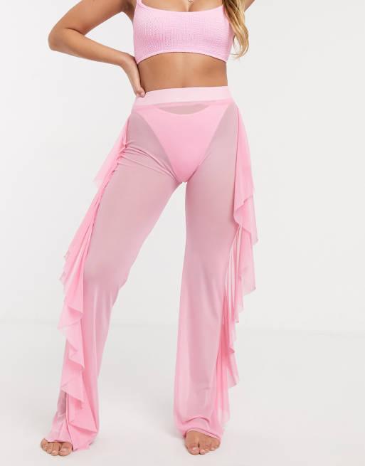 ASOS DESIGN jersey sheer mesh frill beach trouser in dolly pink