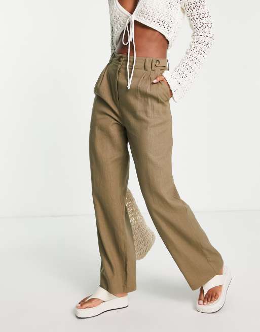 Topshop mid rise linen straight leg button detail trouser in khaki