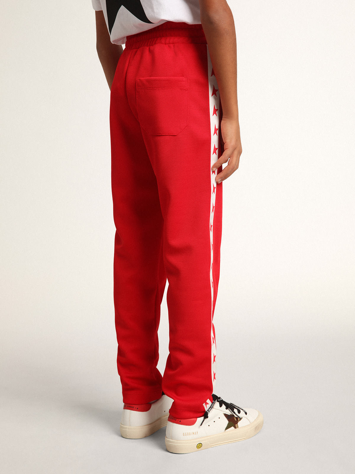 Red joggers with white stripe with contrasting red stars Golden