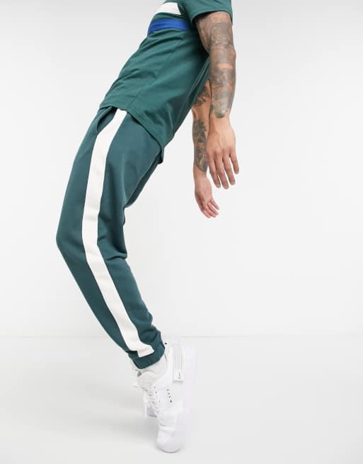 ASOS DESIGN tracksuit crew skinny jogger with side stripe in deep green