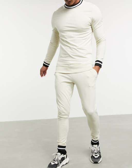 ASOS DESIGN muscle tracksuit with striped rib in beige and super