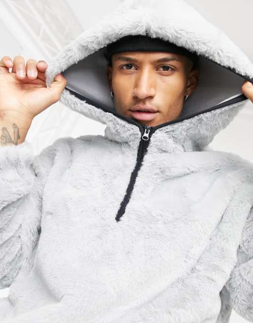 ASOS DESIGN oversized faux fur hoodie in gray with binding high neck