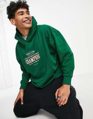 Oversized Pullover Hoodie In Green With Champions Print