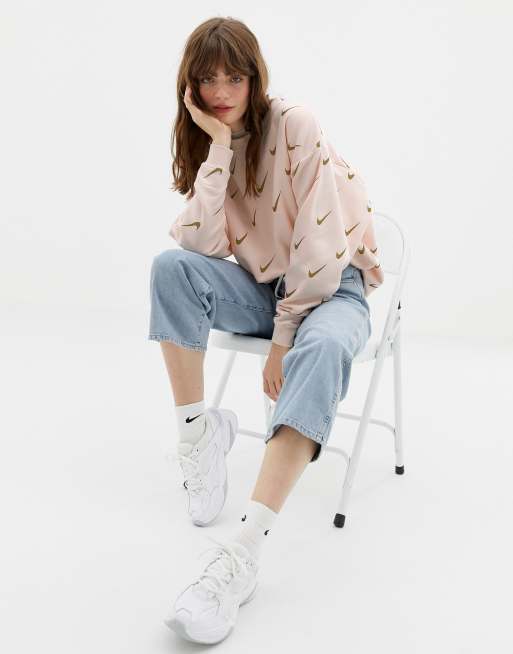 Nike pink mini clearance gold swoosh sweatshirt, Nike Mini Swoosh Oversized Boxy Light Beige Sweatshirt in Natural clearance