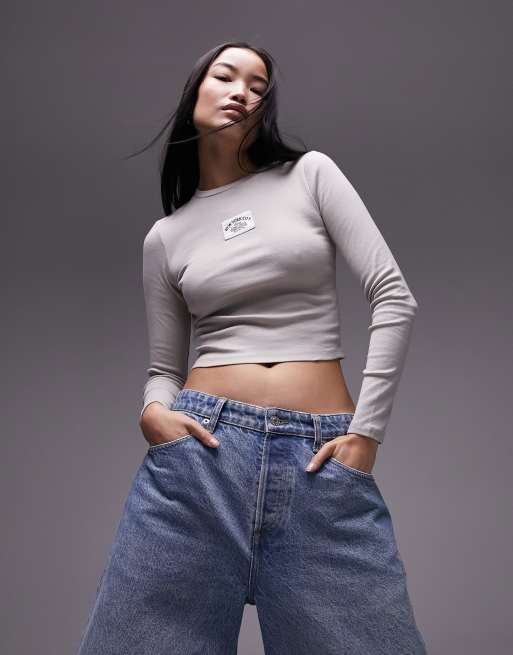 Topshop graphic patch longline long sleeve everyday tee in gray