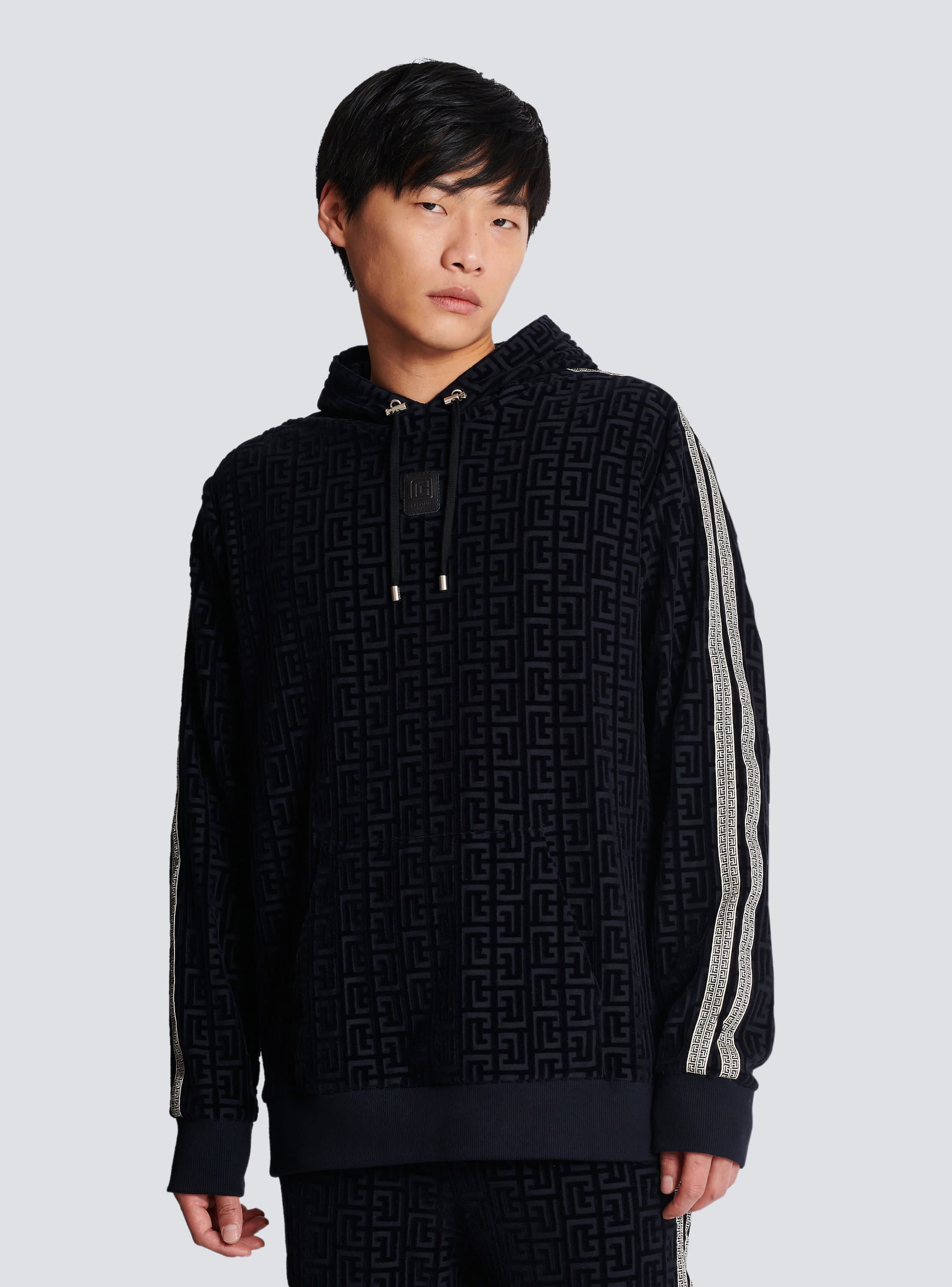 Monogrammed velvet hooded sweatshirt navy Men BALMAIN
