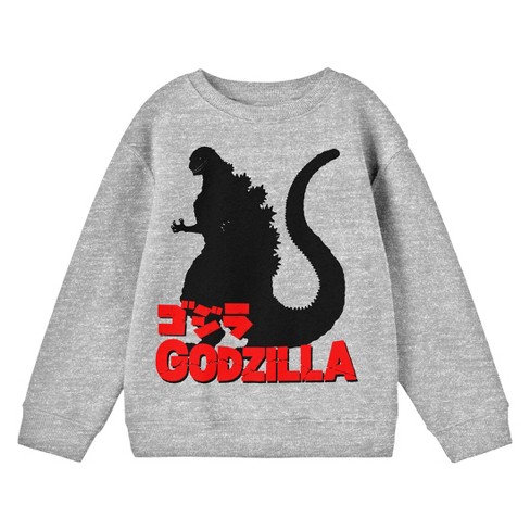 Godzilla Classic Character Silhouette with Kanji Text Youth Heather Grey Crew Neck Sweatshirt Small
