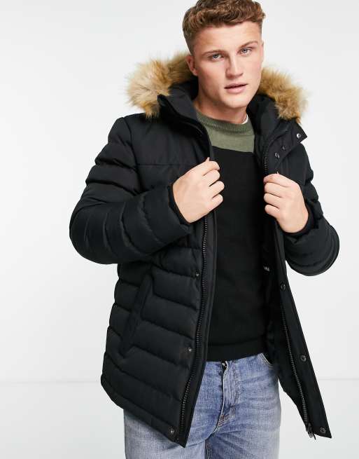 Threadbare padded parka jacket with faux fur hood in black ASOS