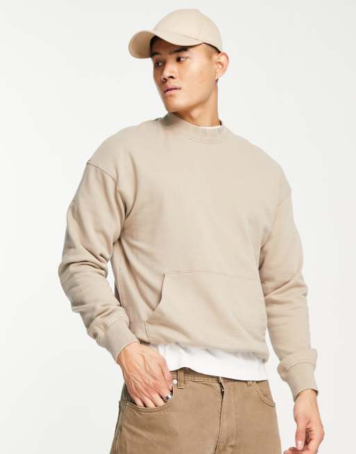 ADPT washed oversized mock neck sweatshirt with front pocket in beige