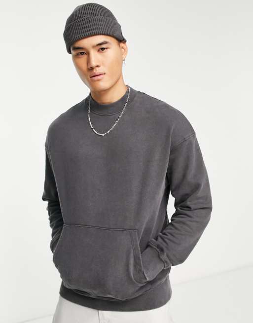ADPT washed oversized mock neck sweatshirt with front pocket in dark gray