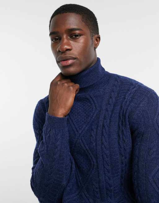 ASOS DESIGN lambswool cable knit rollneck sweater in navy