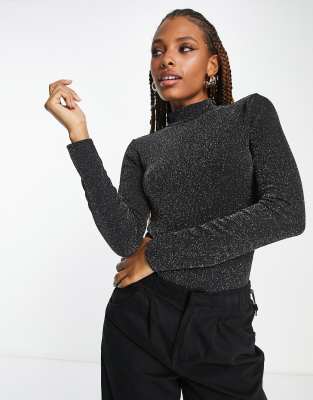 Pieces high neck bodysuit with open back in black glitter ASOS