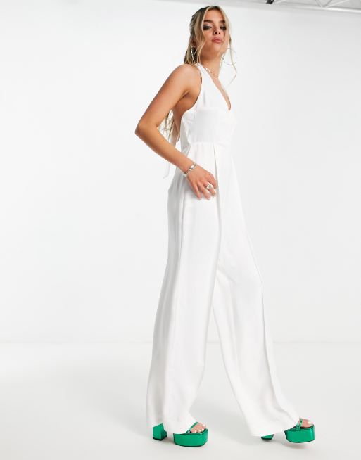 Topshop bridal bow tie shoulder palazzo satin jumpsuit in ivory